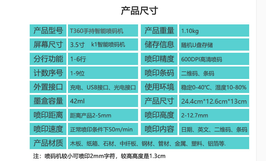 產(chǎn)品特點: 1.簡約風(fēng)格,手持更方便。 2.智能噴碼,噴碼效果清晰。 3.噴碼機(jī)新升級,可直接編輯,多種點狀字。 4.大小面積均可噴碼。 5.4.3寸真彩全觸屏操作界面,所見即所得。